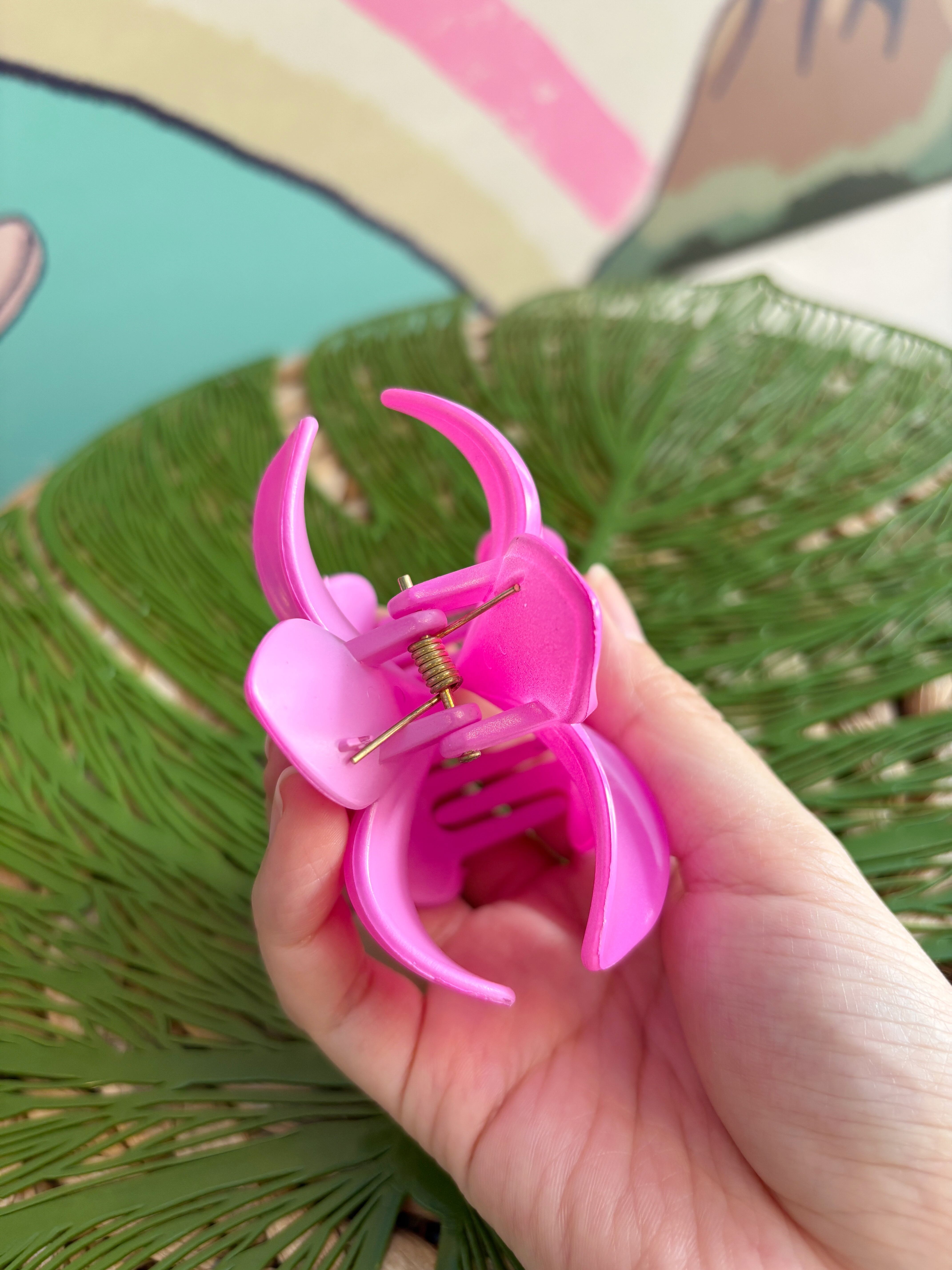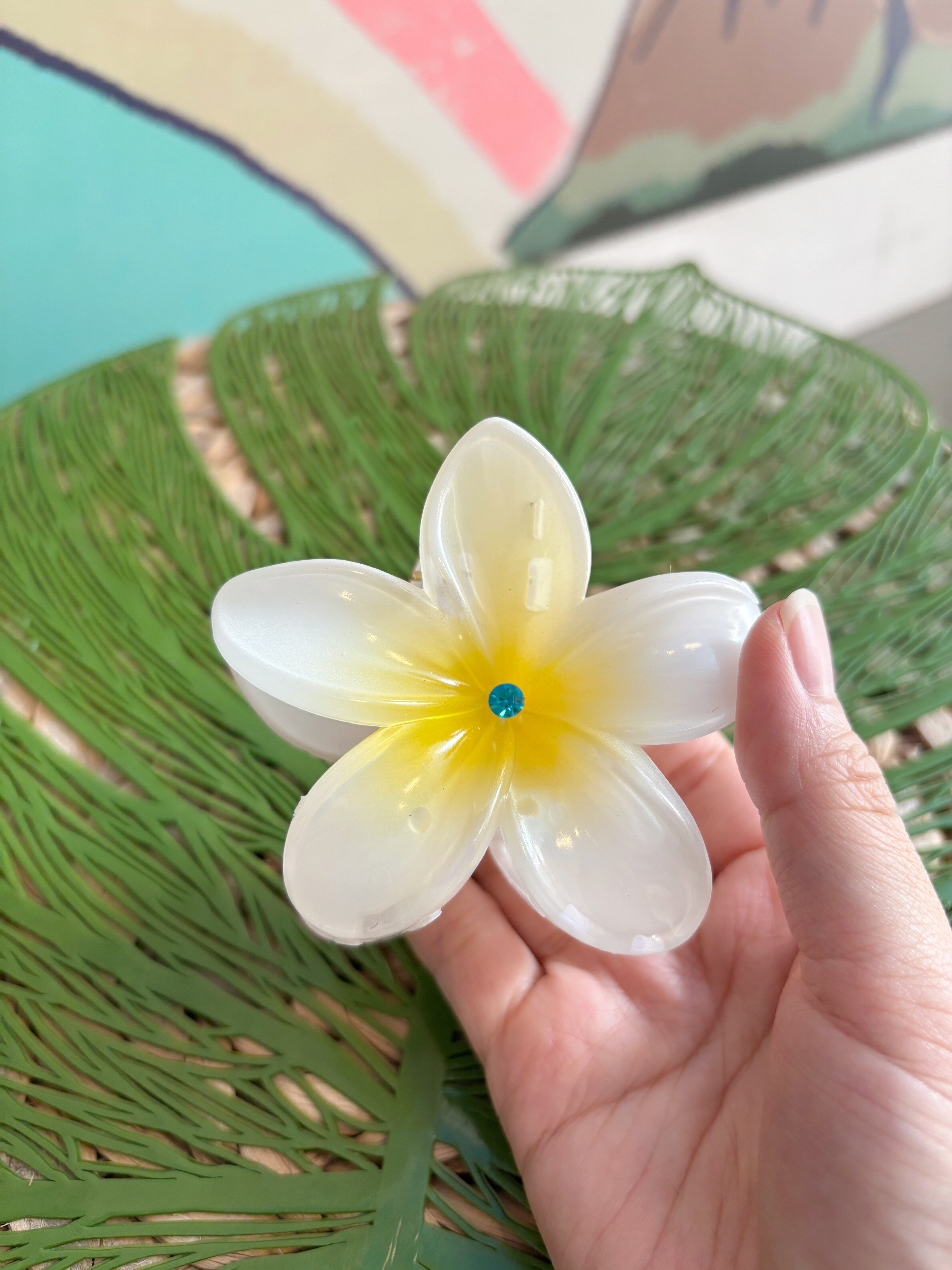 大きなプルメリアのヘアクリップで、ラインストーンがキラリと煌めいて華やかな印象に。