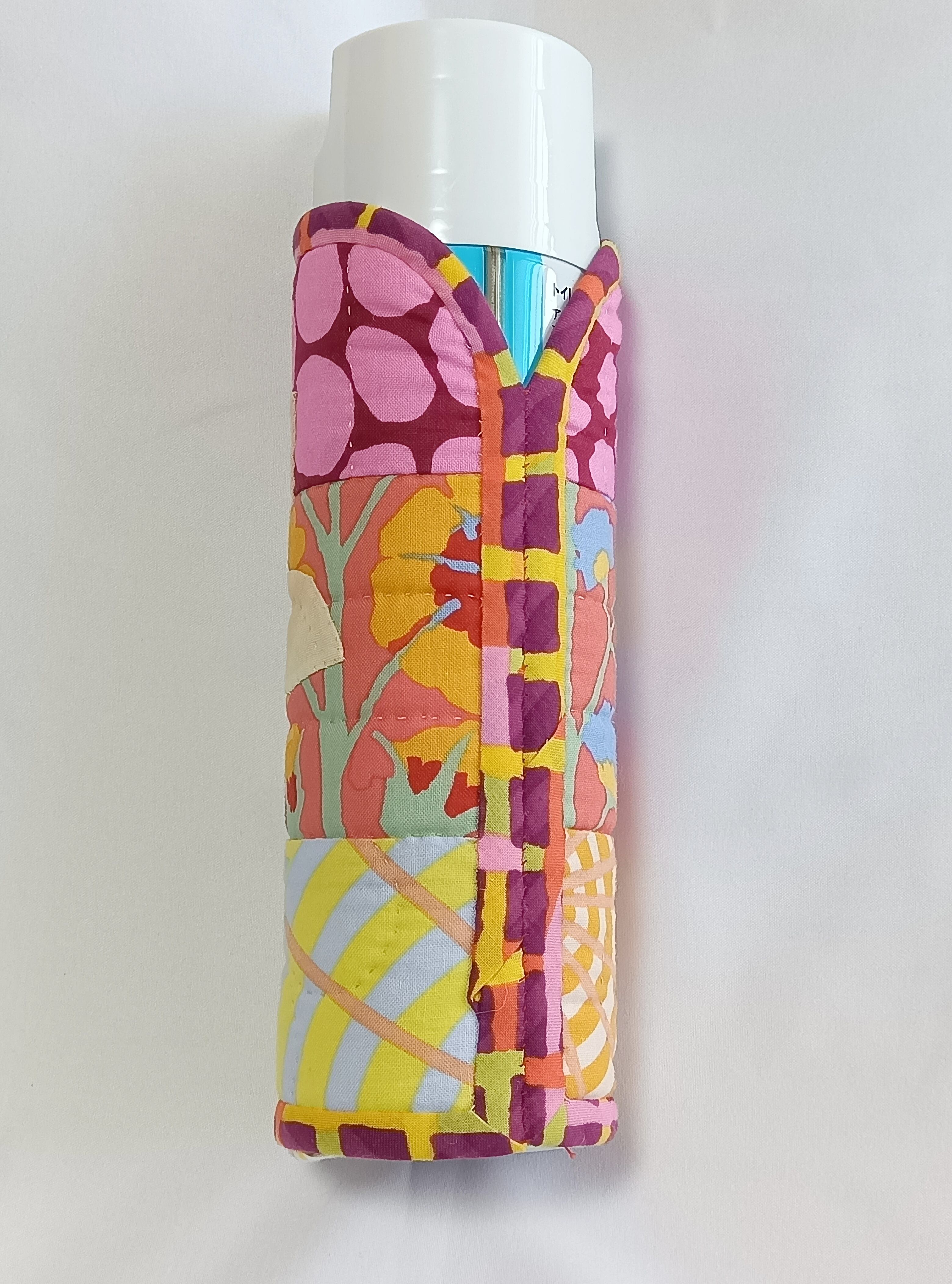ケイフファセットの明るい生地にホヌをアップリケしたスプレー缶カバーです。