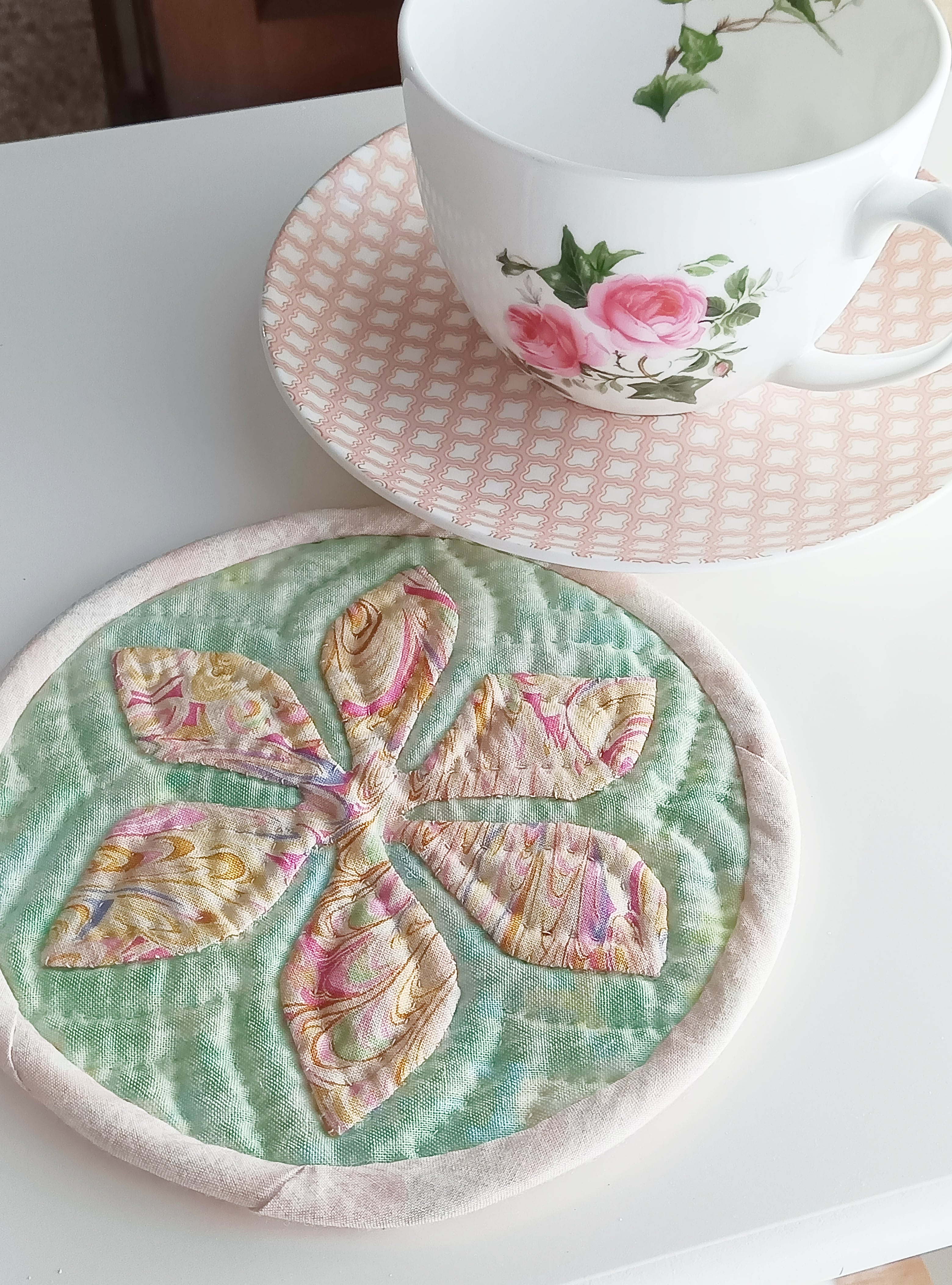 淡いグリーン系の生地にティアレをアップリケしたコースターです。