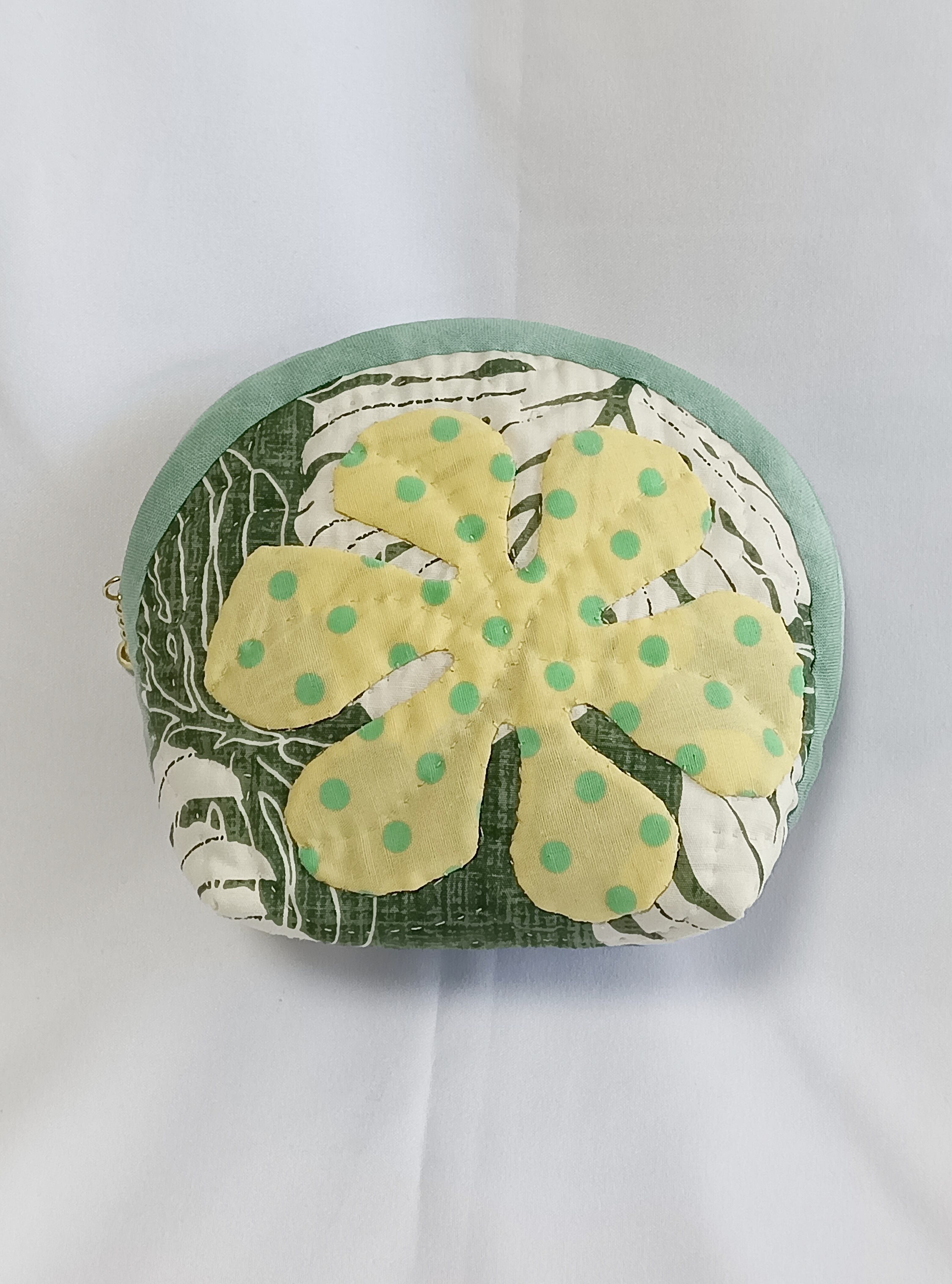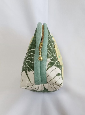 グリーン系のモンステラ柄の生地にドットのティアレをパッチワークしたミニポーチです。