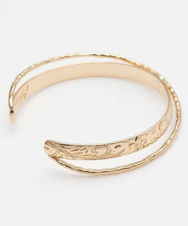 全体にハワイアンジュエリー調の彫が施され、このバングル1つでコーディネートが決まります。