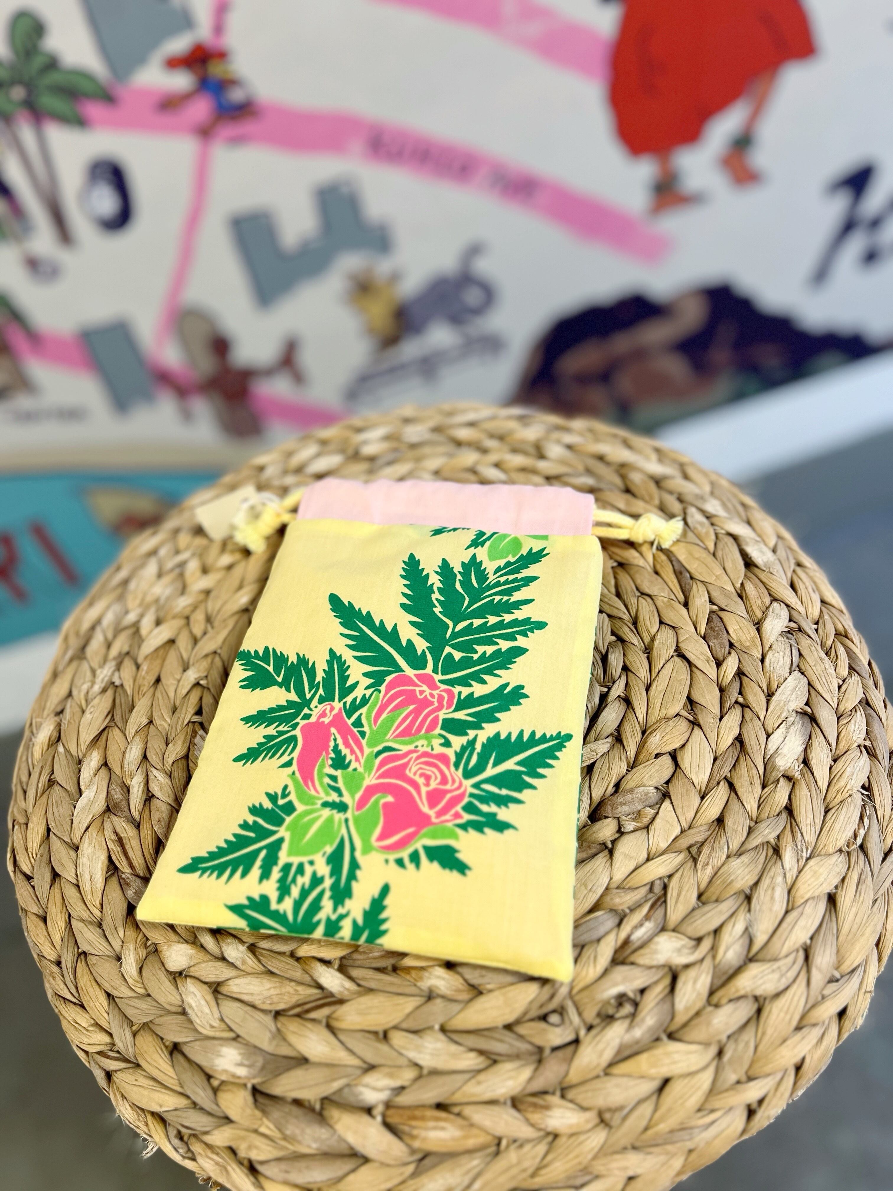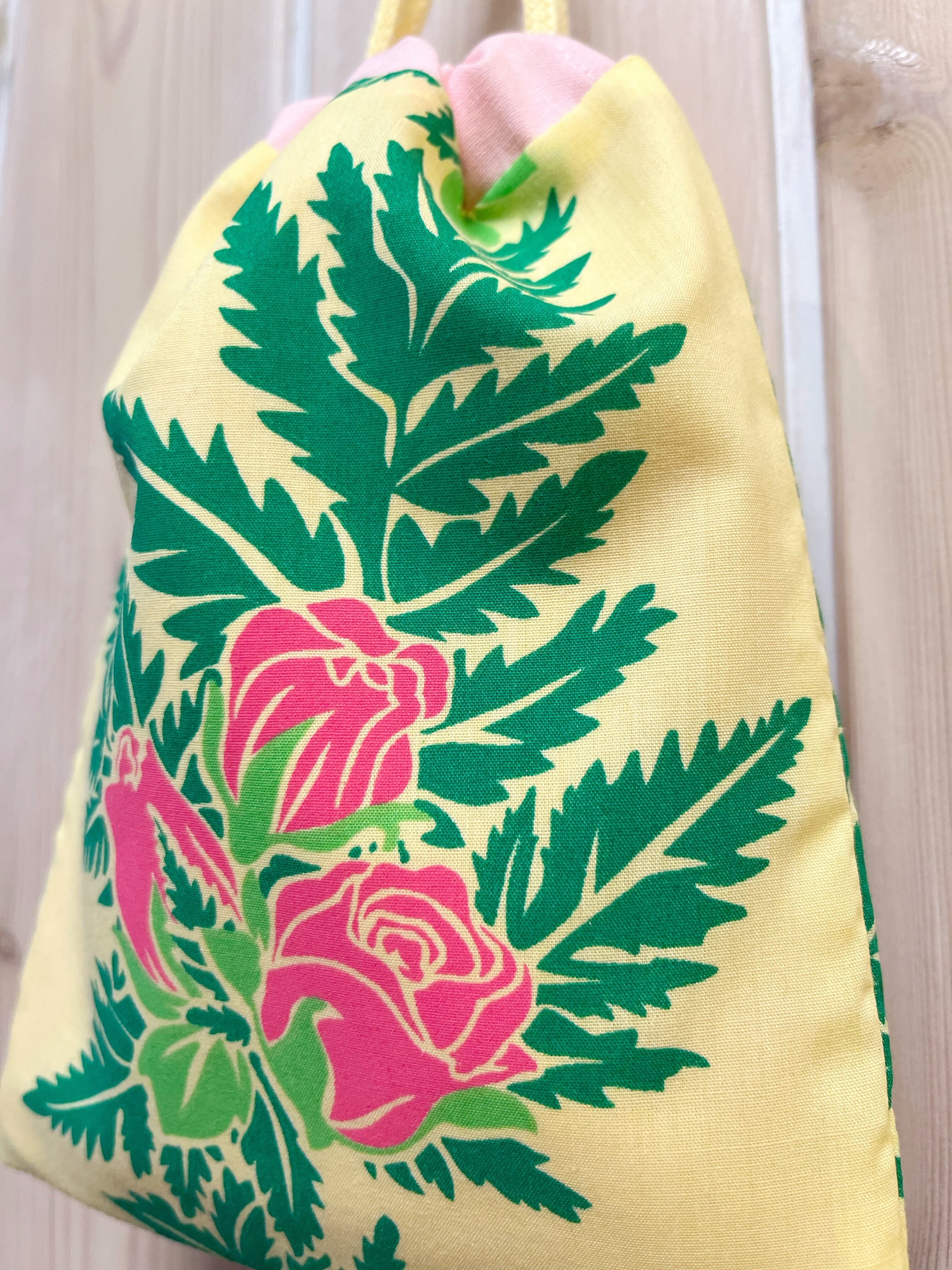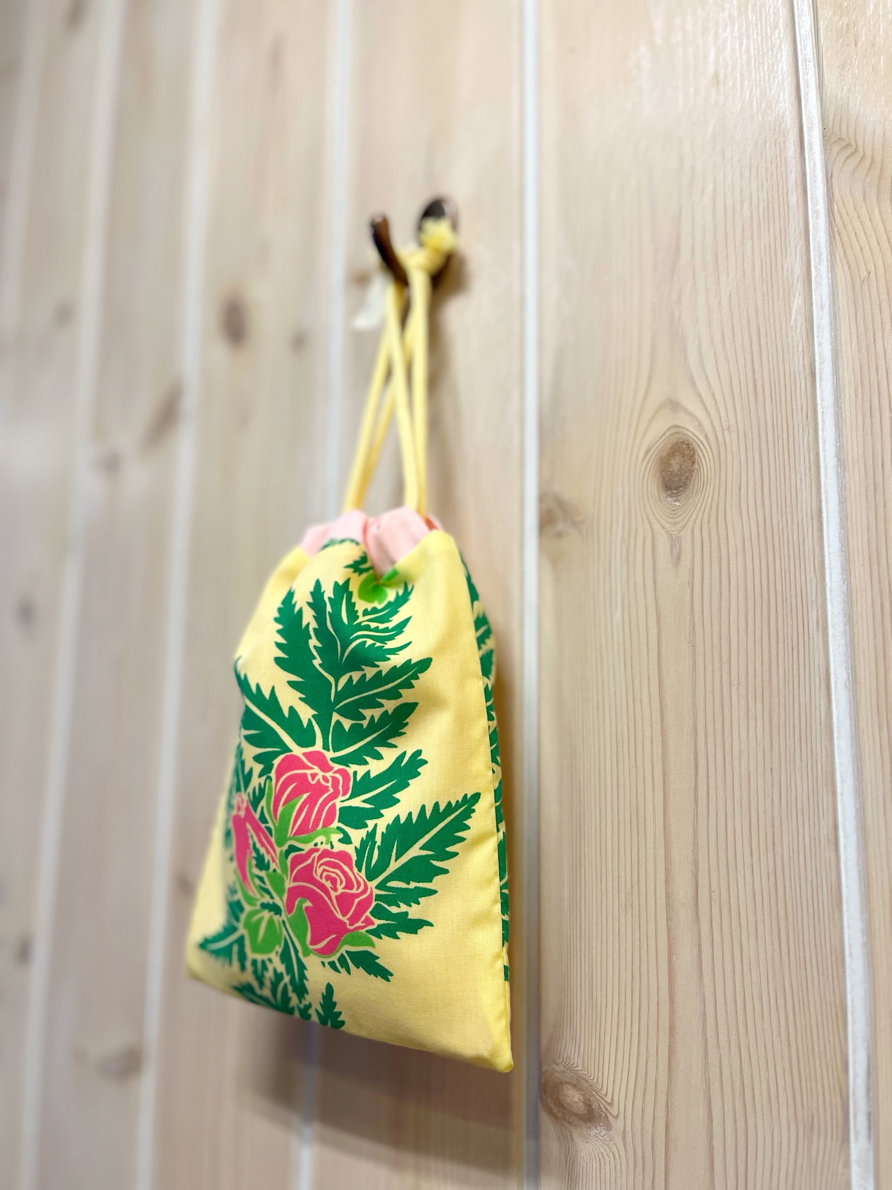 この巾着袋は、小物が入る便利なサイズで、旅行やお出かけにぴったりです。