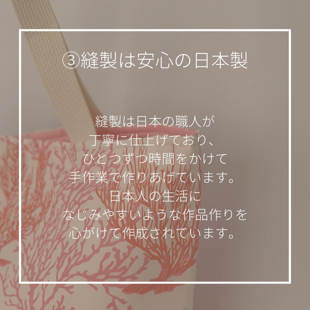 縫製は日本の職人が丁寧に仕上げており、ひとつずつ時間をかけて手作業で作りあげています。日本人の生活になじみやすいような作品作りを心がけて製作されています。